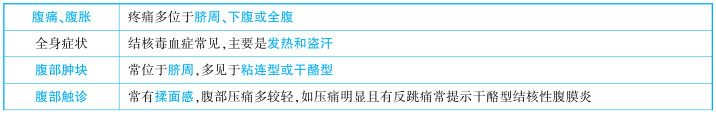 (2)体征:腹膜刺激征(腹部压痛、反跳痛和腹肌紧张)是腹膜炎的标志性体征。
