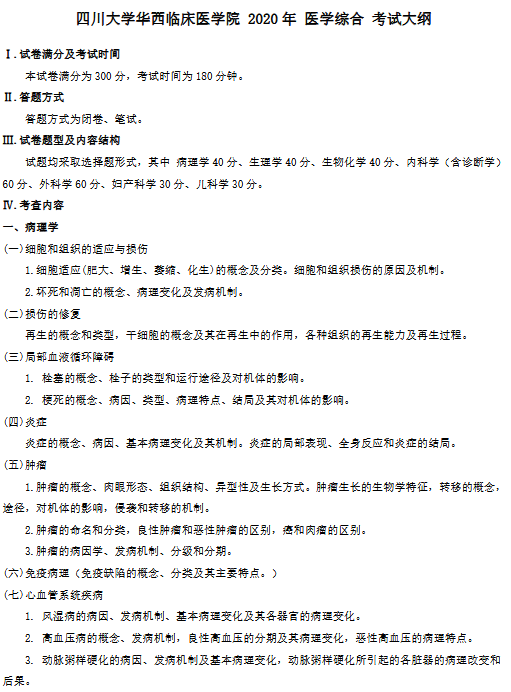 华西临床医学院2020硕士研究生入学考试709医学综合考试大纲已发布,博傲教育为各位考生收集到以下信息,请相关考生注意。