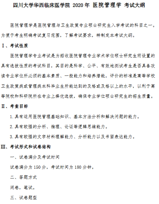 华西临床医学院2020硕士研究生入学考试818医院管理考试大纲已发布,博傲教育为各位考生收集到以下信息,请相关考生注意。