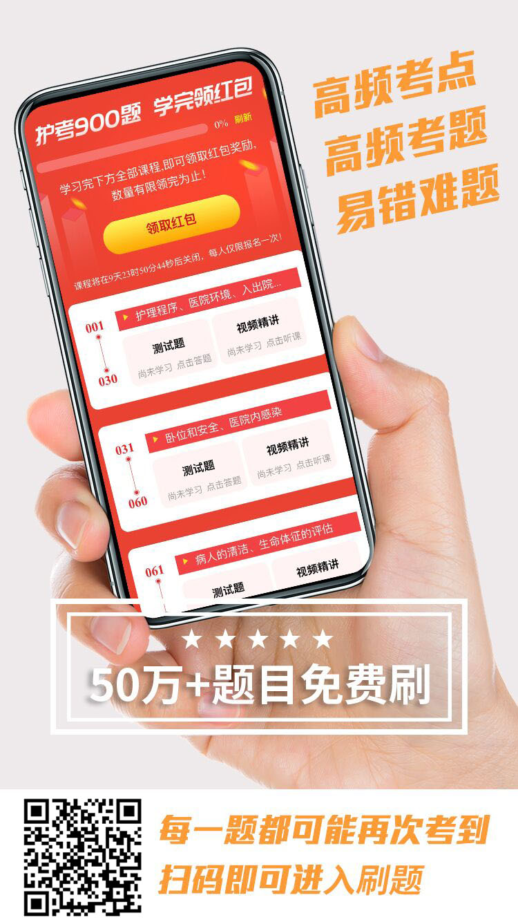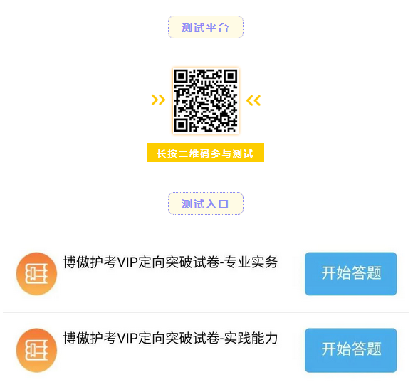 此时此刻,小伙伴们在做什么?如果你还没开始认真备考的话,估计今年考试就真的悬了!要想杜绝这种结果的发生,备考、刷题、测试、听课任何一个环节都至关重要,合理运用可大幅度提升成绩。 高频考点、考题 备考复习当中,考生通过刷题可以很好地检查自己的复习成果,越到复习后期,考生刷题量越大。精选考题、高频考点、易错难题,是考生不容错过的。考生都在四处搜集一些护考试题,博傲护考900题免费领取做强化,是考生不错的选择。点击护考900题,马上领取! 定向测试大PK 为更好的考察考生的复习成果,博傲教育开展了护考成绩大PK活动,把给博傲学员辅导的历年高频考点和考试重点重新组成试卷,供所有考生测评,有意向的伙伴,可以通过博傲金题参与测试!看看自己的成绩如何,为后期复习寻找方向。 专业老师答疑解惑 备考很艰难,形势很急迫,问题很严重。为进一步帮助考生更好的复习,解决目前考生存在的疑惑,关老师将在本周六(7月4日)晚上7:30公开讲课,帮大家分析问题,解决问题!在复习时有疑问的朋友,都可以进行咨询学习。 护考是取得护士证的唯一途径,看似简单实则不易的考试,想顺利通过此次考试,考生则必须下功夫来学习,只有这样方可成功! 我们能提前预知分数线,当然知道考什么!课程咨询热线:400-6286615 我们连续六年精准预测了护士考试分数线和考试大纲,扫描下面的“ChinaNERC”微信二维码或加QQ群号:656216869、780460254。即可提前获取各种最近护考信息: 扫一扫关注护理研究中心二维码 扫描下方金题二维码即可免费注册APP,海量模拟真题等你来!