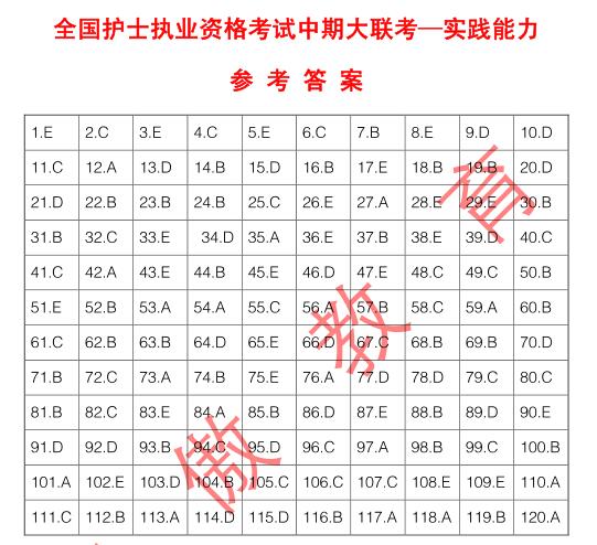 2020全国护士官方大联考(中期)已经圆满结束,参加此次考试的人数相当多,昨日,关老师针对(实践能力)测试部分作了在线解析! 部分考生受各种原因的影响,无法即时观看到关老师直播,对于试题正确答案不是很清楚,小编特整理(实践能力)正确答案如下图: 参加考试的小伙伴,可以根据此表,来判定自己错在哪里,有针对性进行分析,这样对日后的复习,还是相当有帮助的。 对于那些参加过(实践能力)的朋友,由于紧张,记不清楚原题的朋友,或是没有参加(实践能力)测试的朋友,小编特意整理电子版试卷,部分内容展示如下: 大联考(实践能力)第一部分测试 大联考(实践能力)第二部分测试 想获取完整版试卷的小伙伴,可以扫描以下二维码,加入20护士资格考试指导群,联系管理老师之后,便可获取完整版试卷! 在肺炎防疫的这个阶段,许多学员都呆在家中,无法返回学校。报名参加护考的朋友,利用此阶段好好学习。面授课程无法进行,选择博傲网课成为优先之选。 我们能提前预知分数线,当然知道考什么!课程咨询热线:400-6286615 我们连续六年精准预测了护士考试分数线和考试大纲,扫描下面的“ChinaNERC”微信二维码或加QQ群号:457734051(护士)、471131230(护师)。即可提前获取各种最近护考信息: 扫一扫关注护理研究中心二维码 扫描下方金题二维码即可免费注册APP,海量模拟真题等你来!