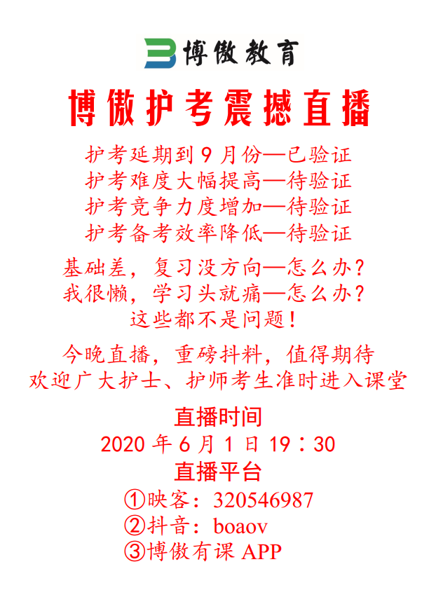 中国卫生人才网最新消息:护士、护师考试时间已经确定,2020护士资格考试时间定于9月12日—15日举行,共有4天,分为八个轮次,具体考试时间安排如下: 卫生专业技术资格考试时间定于9月12、13、19、20、26、27日举行,具体考试安排如下: 看到官方时间之后,预示着我们再次精准预测了护考时间,在预测之初,各种争议、各种谩骂,但是总有一部分粉丝坚定着支持我们,在此,表示感谢! 护士、护师考试应对策略 扫码即可进入有课平台 我们能提前预知分数线,当然知道考什么!课程咨询热线:400-6286615 我们连续六年精准预测了护士考试分数线和考试大纲,扫描下面的“ChinaNERC”微信二维码或加QQ群号:457734051(护士)、471131230(护师)。即可提前获取各种最近护考信息: 扫一扫关注护理研究中心二维码 扫描下方金题二维码免费注册APP,海量模拟真题等你来!