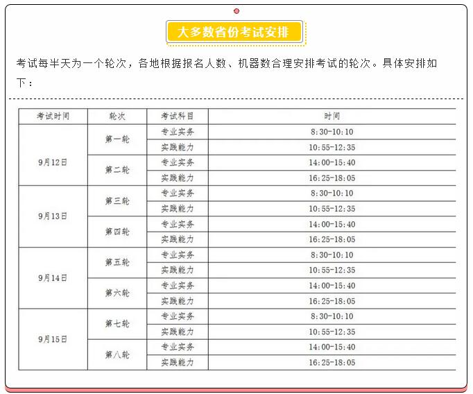 护士资格考试时间官方已给出确切消息,9月12-15日,每半天为一个轮次,分四天进行。全国省份考点众多,不同地区时间安排亦存在差异,为何小编会这样说?请接着向下看! 内蒙古兴安盟、辽宁丹东 护士时间安排则不同 仅仅有两天! 公告详情向下看 至于其他考点会不会再有新的通知公布,小编亦会时刻关注,若有何变动之处,会及时告知各位考生朋友。 我们能提前预知分数线,当然知道考什么!课程咨询热线:400-6286615 我们连续六年精准预测了护士考试分数线和考试大纲,扫描下面的“ChinaNERC”微信二维码或加QQ群号:457734051(护士)、471131230(护师)。即可提前获取各种最近护考信息: 扫一扫关注护理研究中心二维码 扫描下方金题二维码免费注册APP,海量模拟真题等你来!
